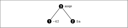 Each opcode is the smallest unit of executable instruction that Perl can think about. You might see an expression like $a = -($b + $c) as one statement, but Perl thinks of it as six separate opcodes. Laid out in a simplified format, the parse tree for that expression would look like Figure 18-2. The numbers represent the visitation order that the Perl run-time system will eventually follow.