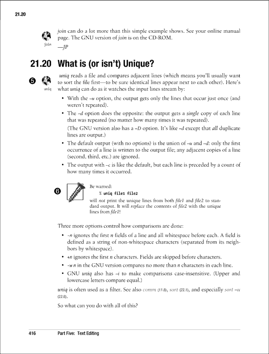 This section refers to conventions used in the print book and explains how they were modified for the online version. The numbers in the following images correspond to the lists below them.